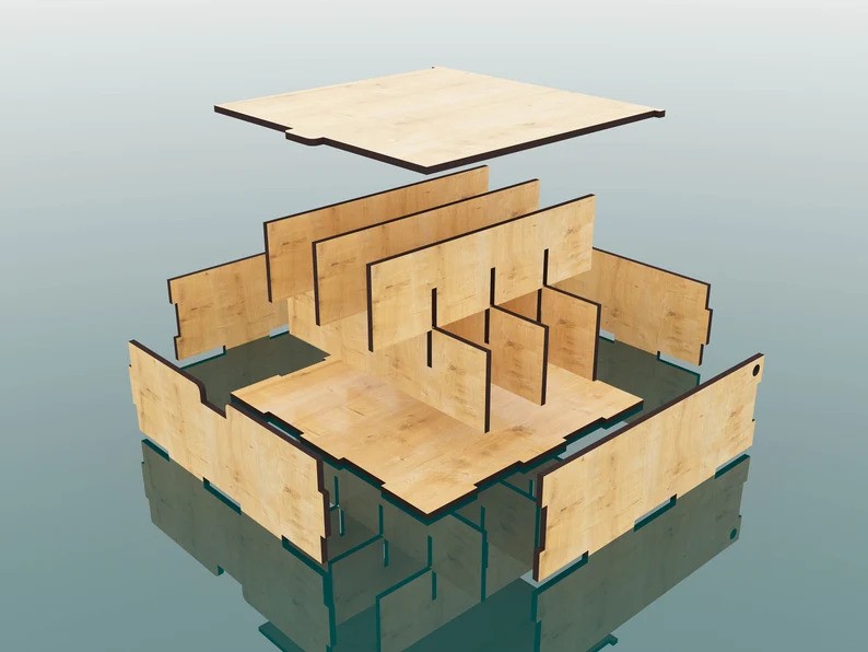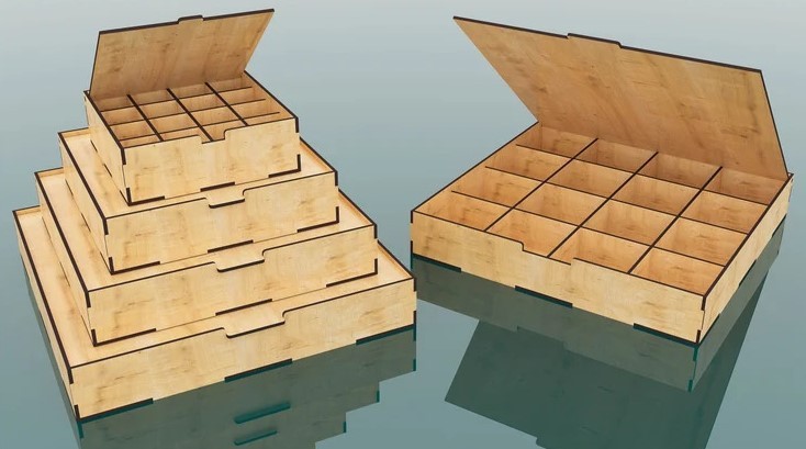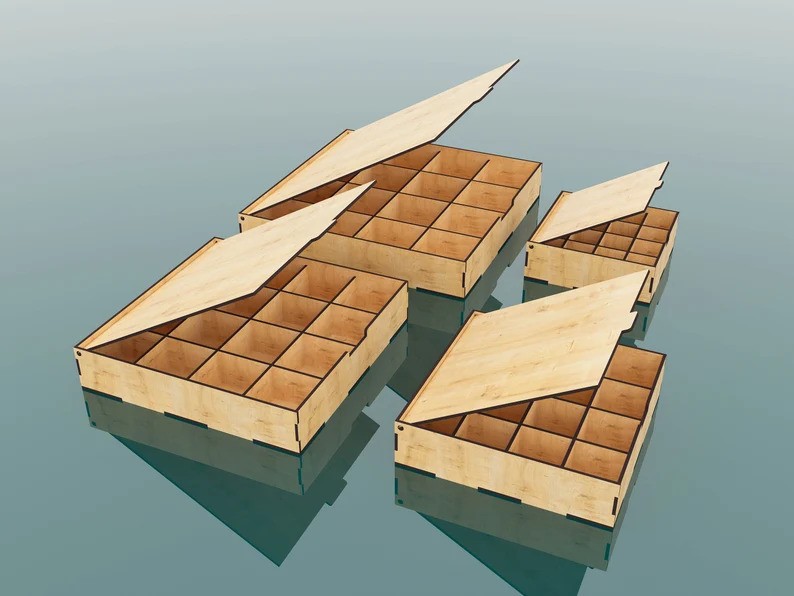 Les Boites de rangement compartimentées sont fabriquées en bois contreplaqué de Pin de 3.6 mm.